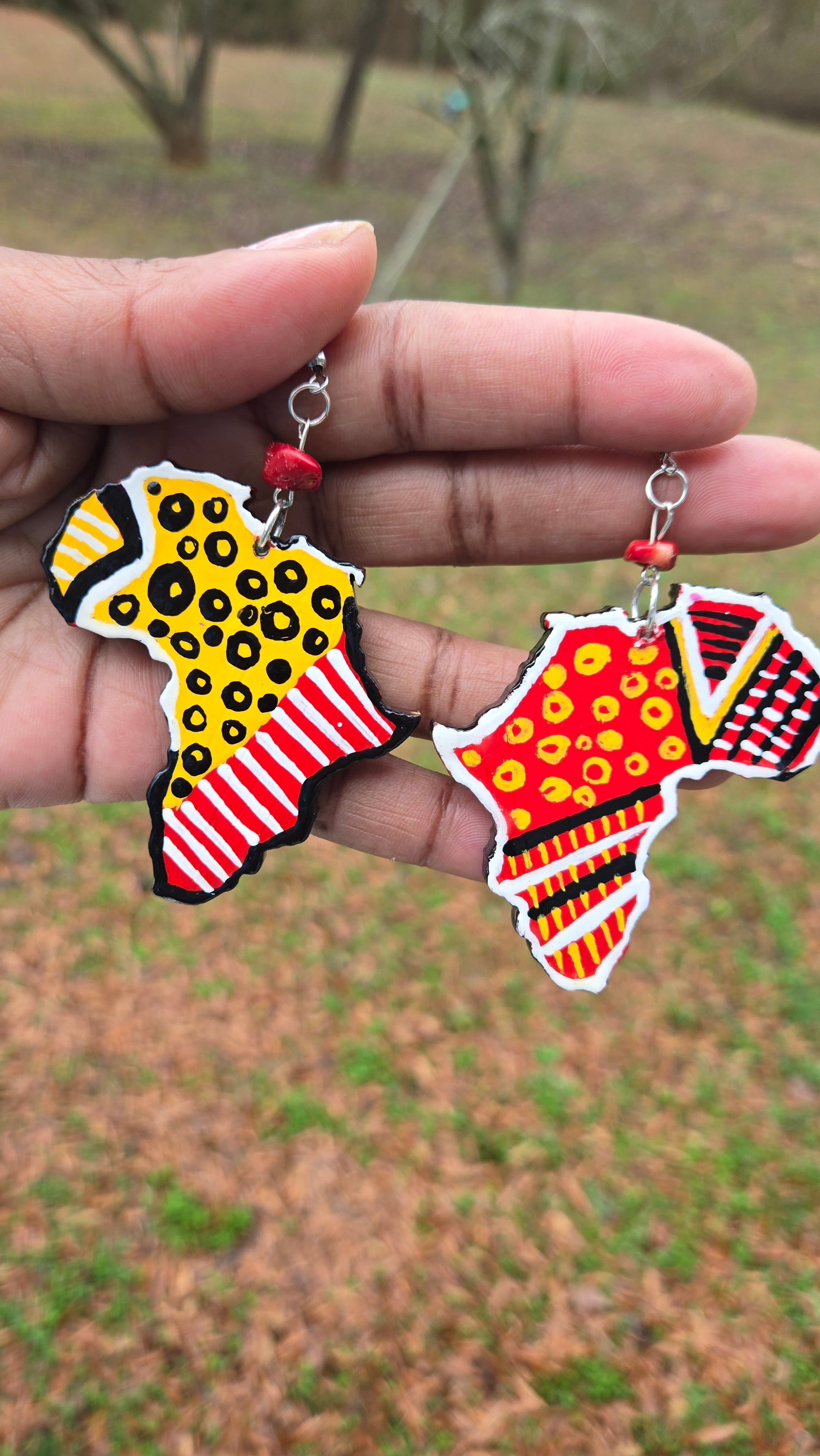 These handpainted wood mudcloth earrings are a conversational piece when wearing them. They are very light weight with black glitter on the back.